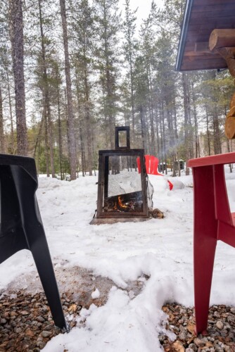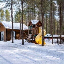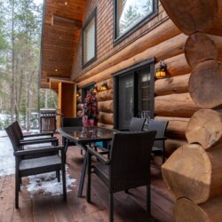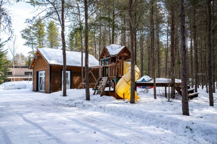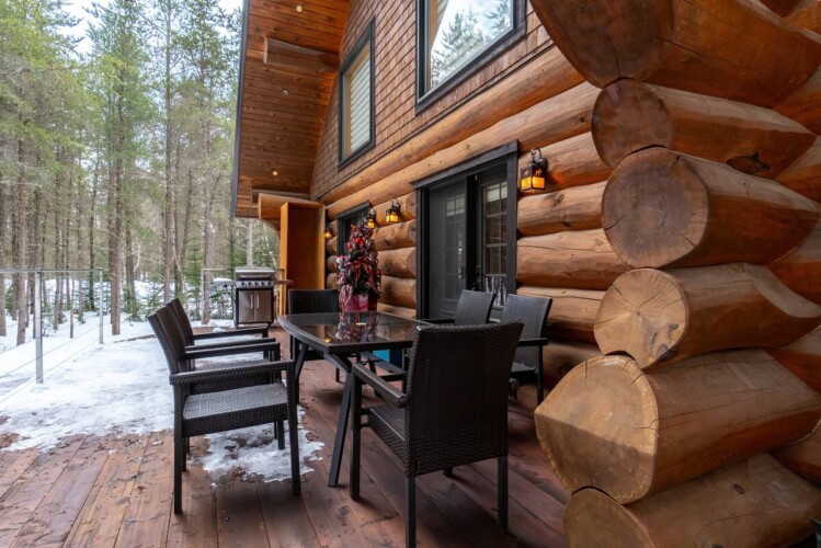 Chalet en bois rond Scandinave en pleine nature.Des sentiers de randonnée, de raquette, VTT/Motoneige sont d’ailleurs accessibles directement à partir du chalet! L’emplacement est idéal pour les amateurs de plein air, tout près de la rivière aux Écorces. Pavillon chauffé avec 3 portes-patios incluant spa de nage, espace pour détente et foyer au bois. Dans le chalet, plafond cathédrale, belle luminosité, grande cuisine bien équipée ainsi qu’un salon avec un foyer au bois.