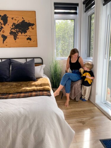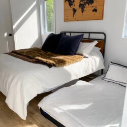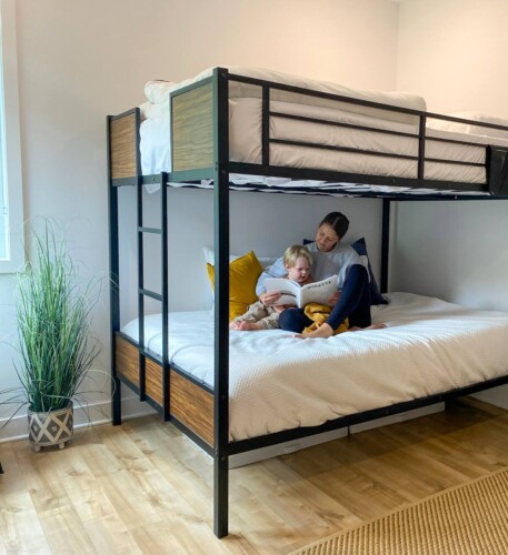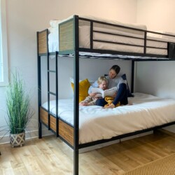 – Il y a deux chambres avec espace de travail, trois lits Queen, deux matelas de sol simples et un lit bébé