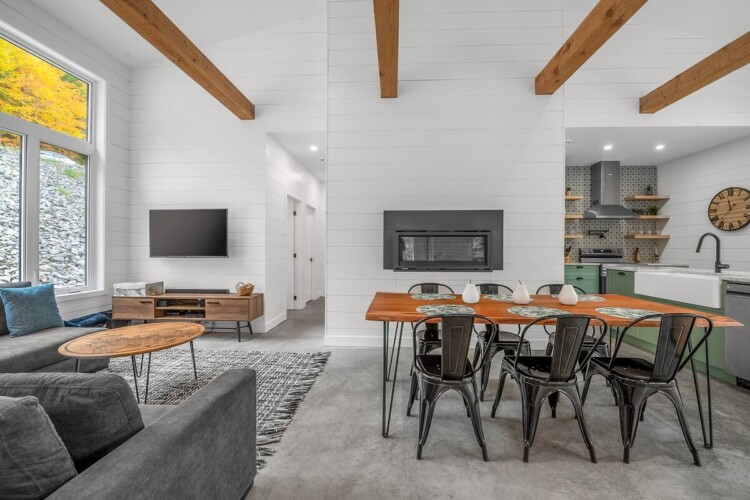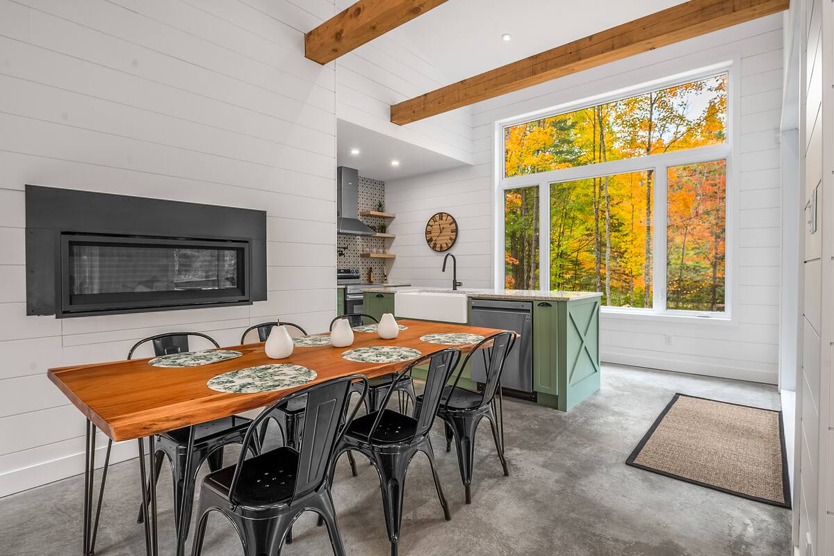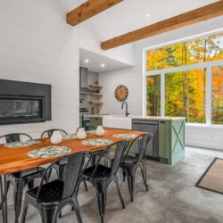 La salle à dîner offre un bel espace convivial avec un magnifique foyer au gaz.