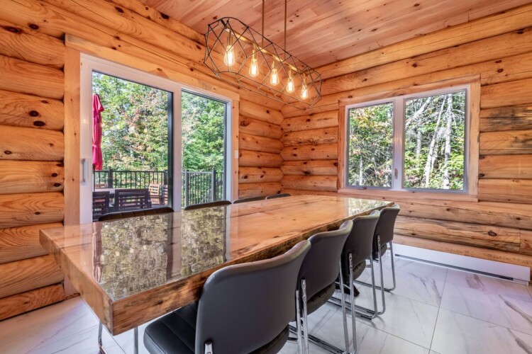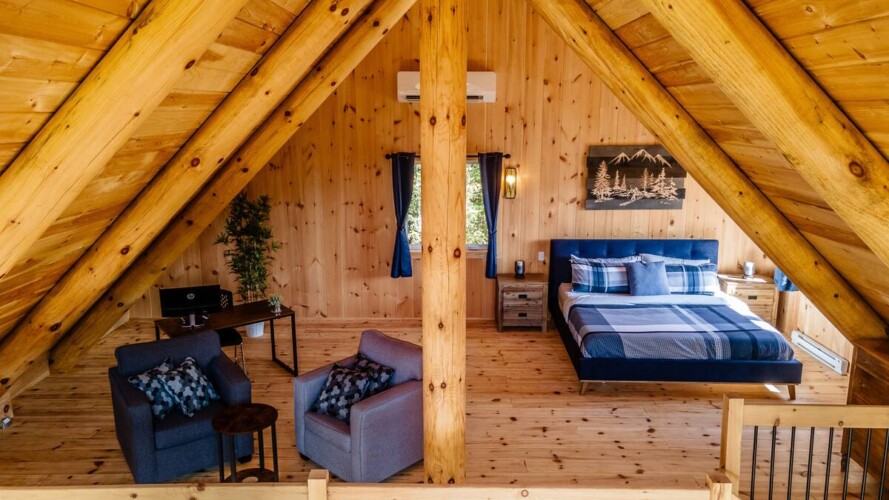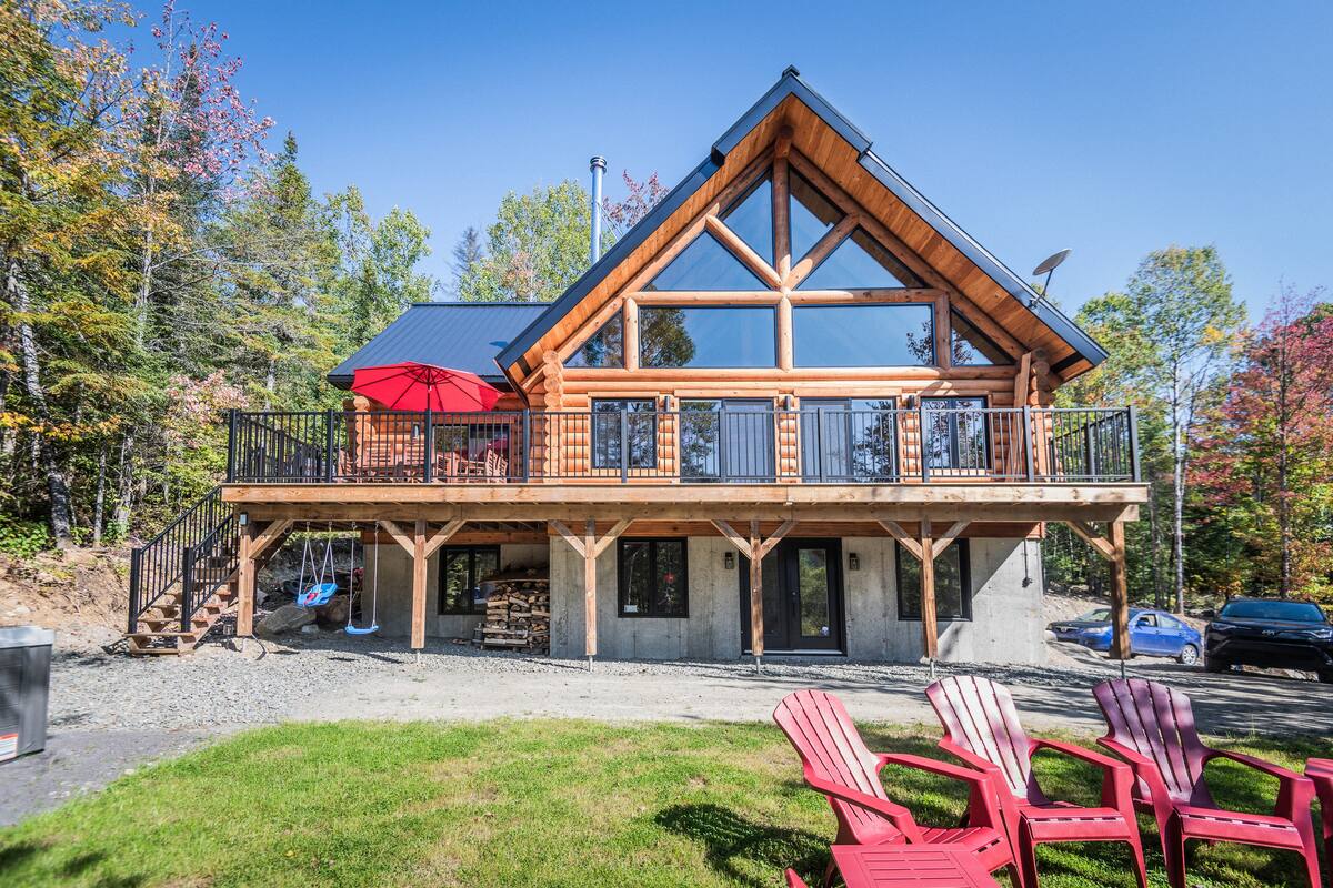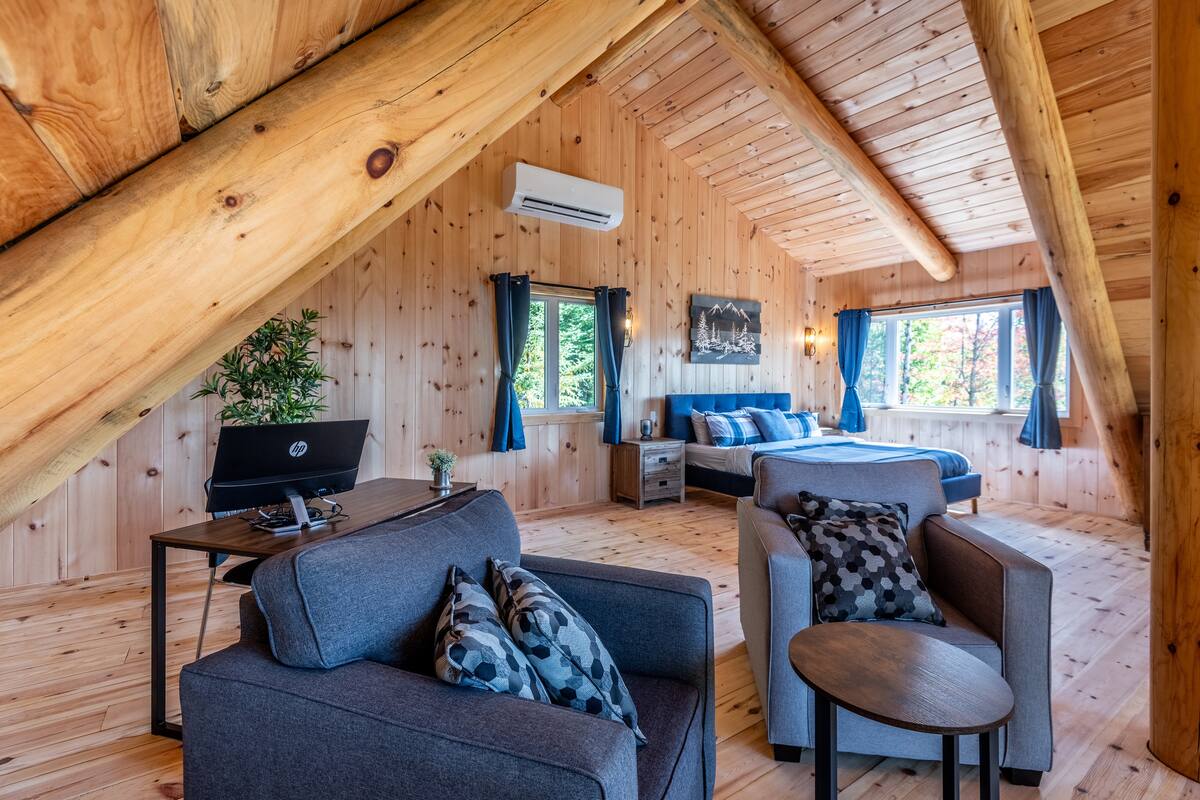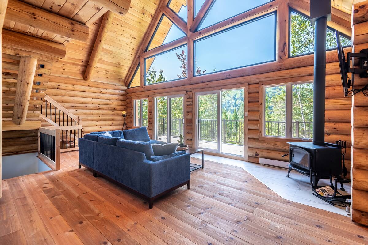 Magnifique chalet en bois rond situé à 1.8km des pistes de ski Val St-Côme qui peut accueillir 12 personnes comprenant 4 chambres, 3 fermés et 1 ouverte sur la mezzanine, 1 divan-lit queen est au salon du rez de jardin.