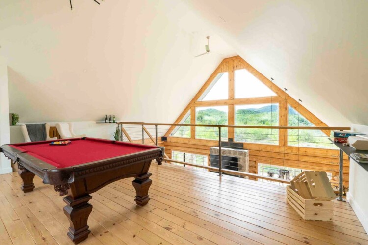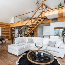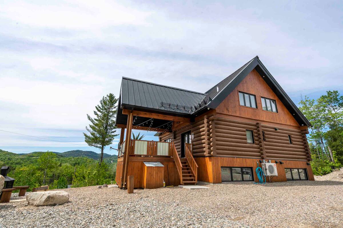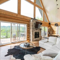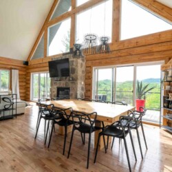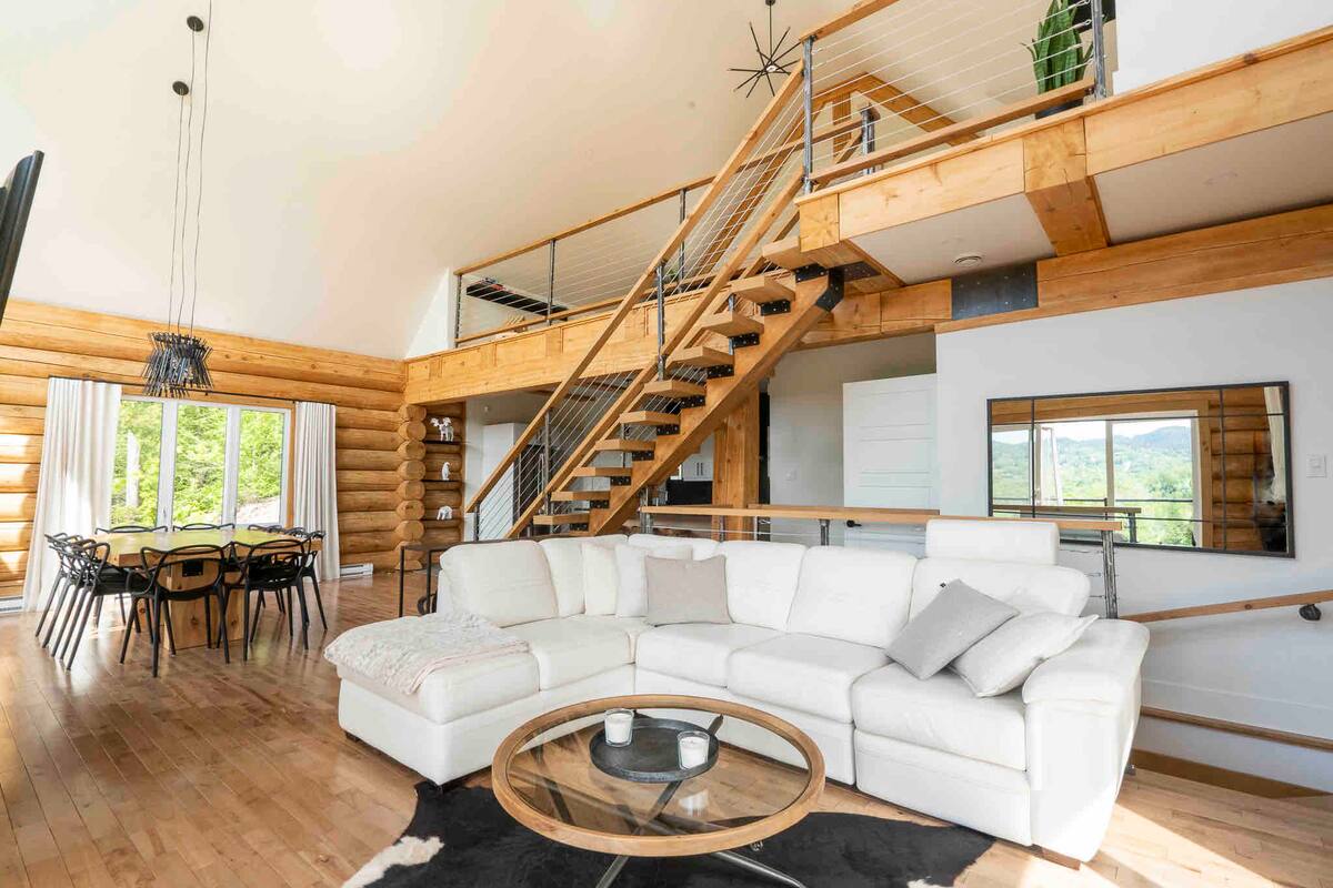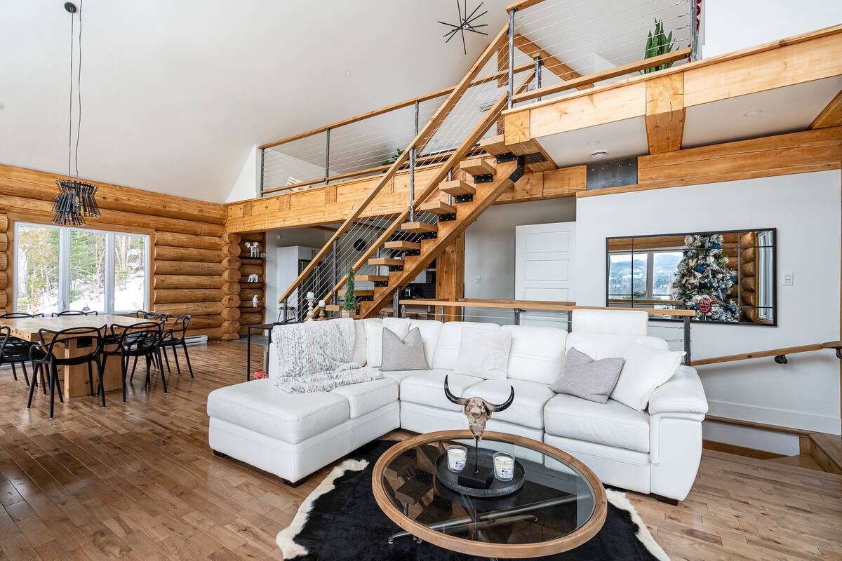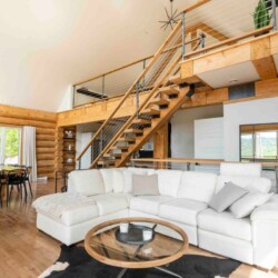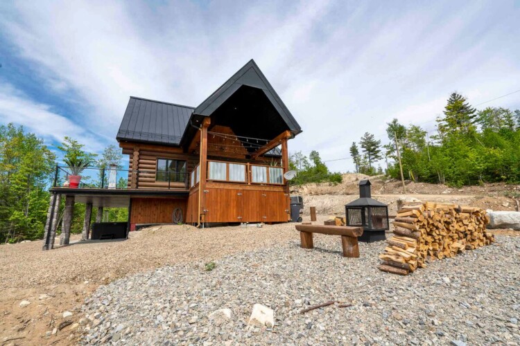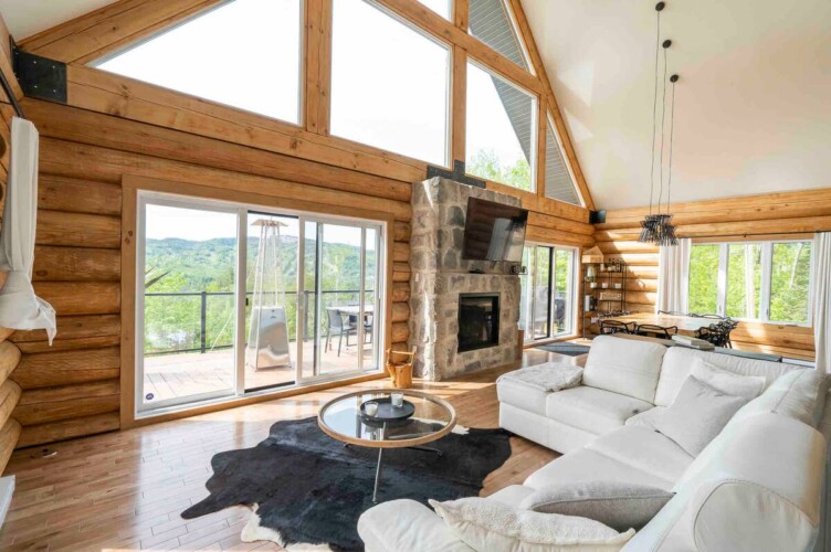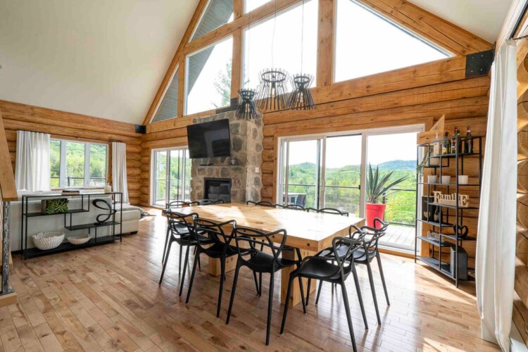 Chalet de bois rond décoré au goût du jour.