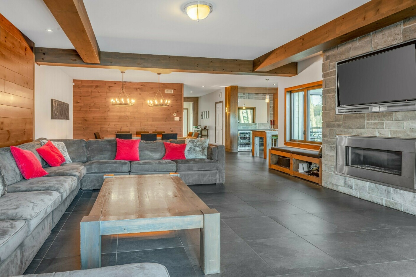 Aire de diner Salon avec foyer et téléviseur Cuisine avec ilot