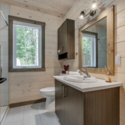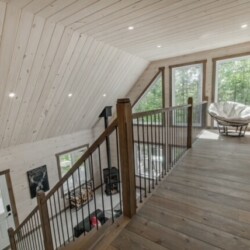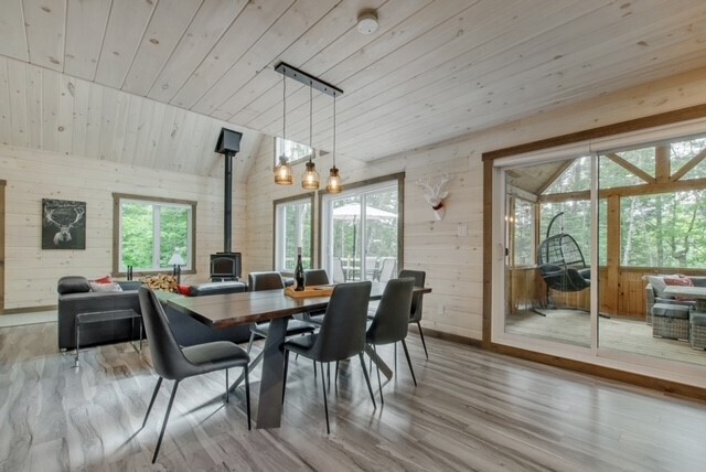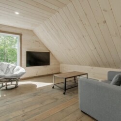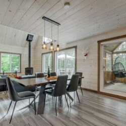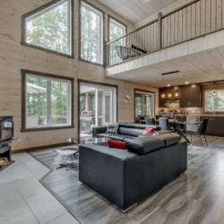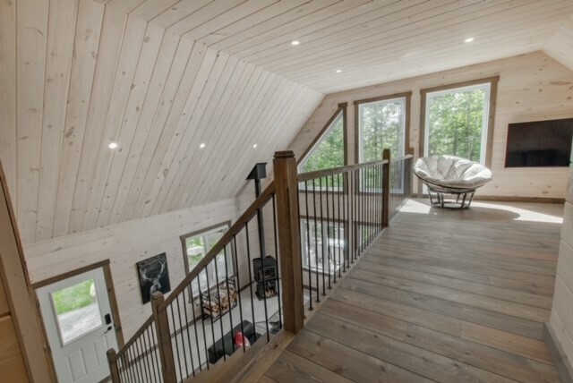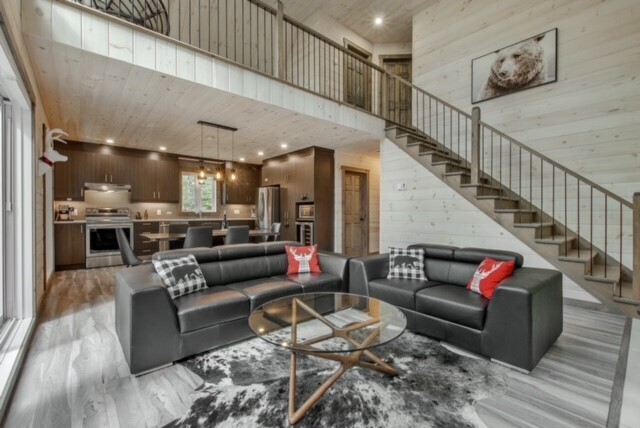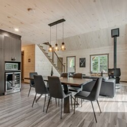 À l’intérieur : L’étage principale du chalet est une aire ouverte avec toit cathédrale et plancher chauffant regroupant une salle à manger, un salon et une cuisine .