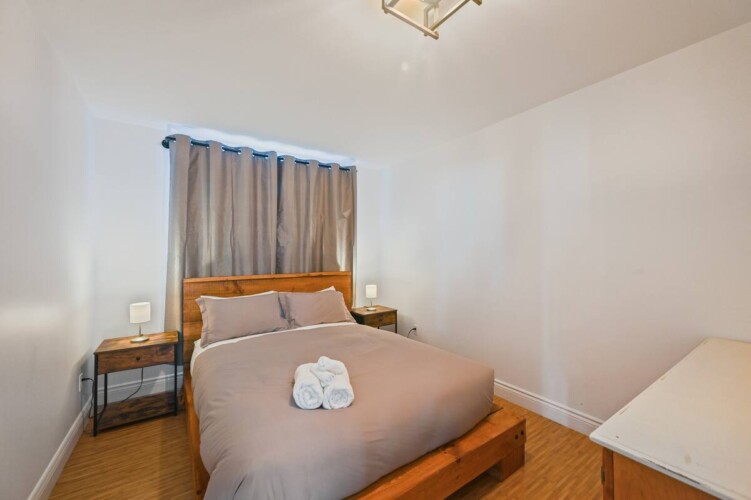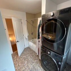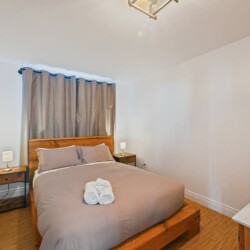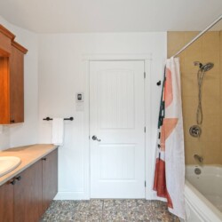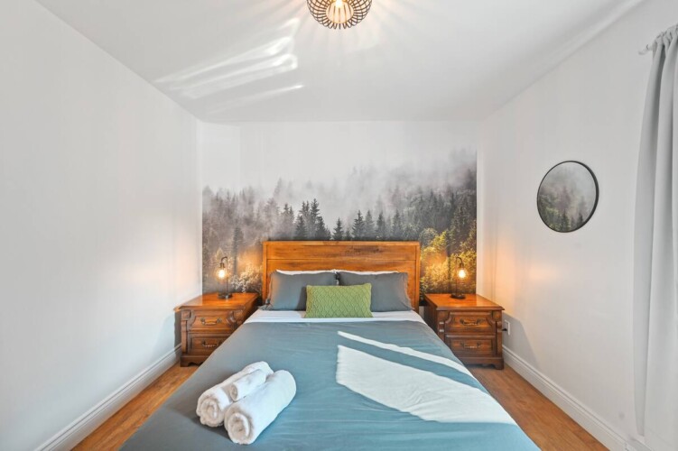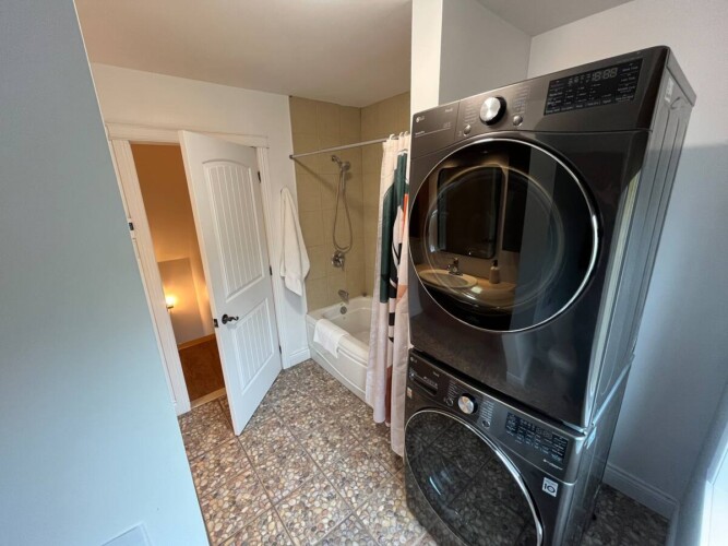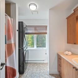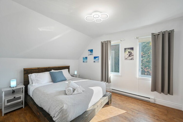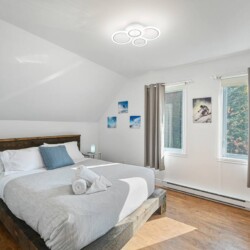 L’aménagement intérieur est complet avec quatre chambres, chacune dotée de lits Queen, et deux salles de bains (une avec baignoire et douche et l’autre avec douche seulement).