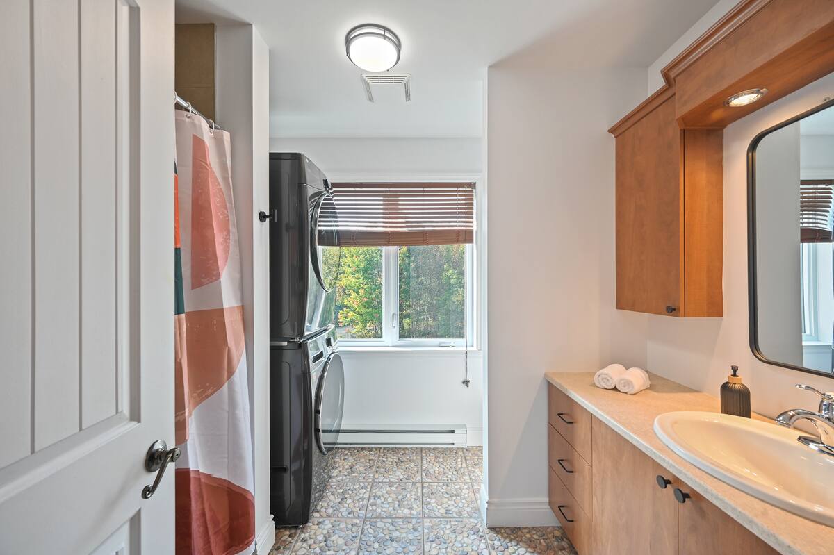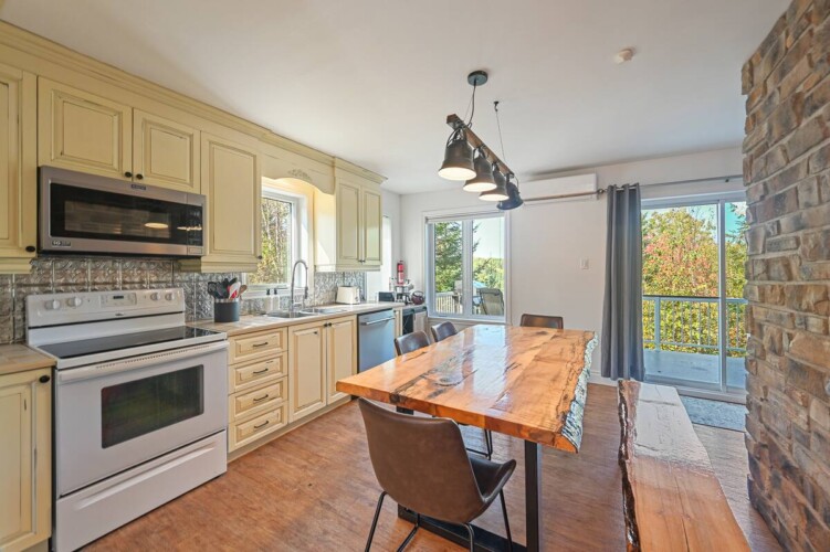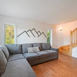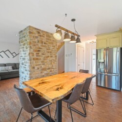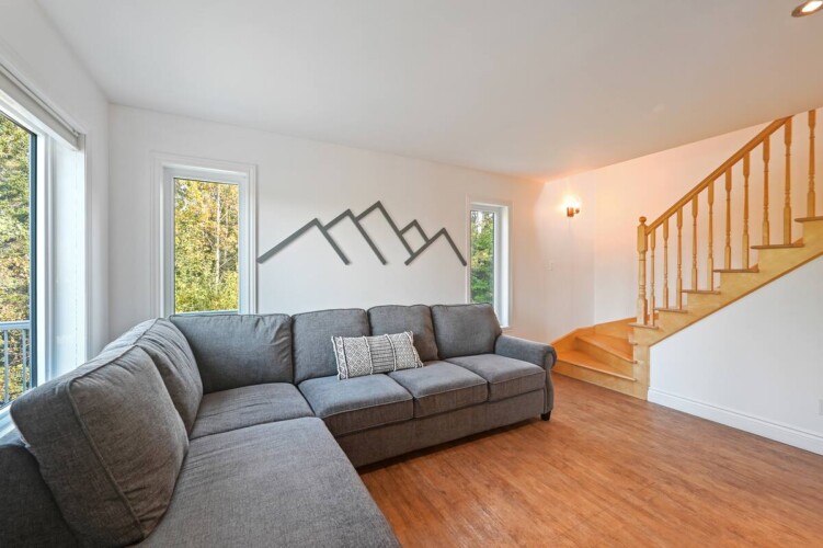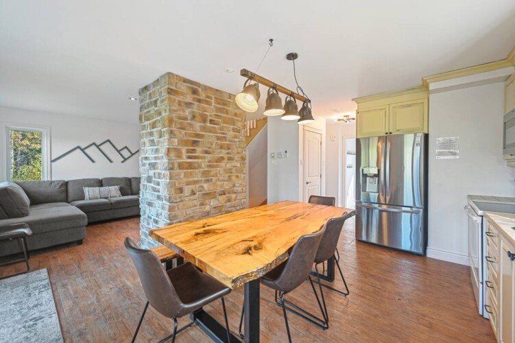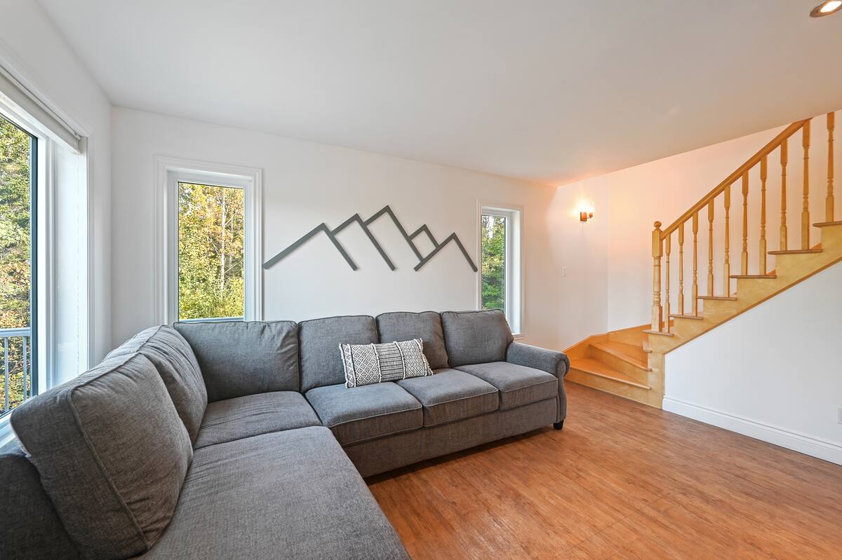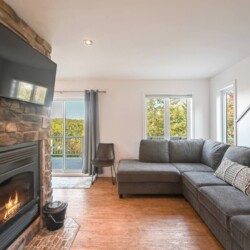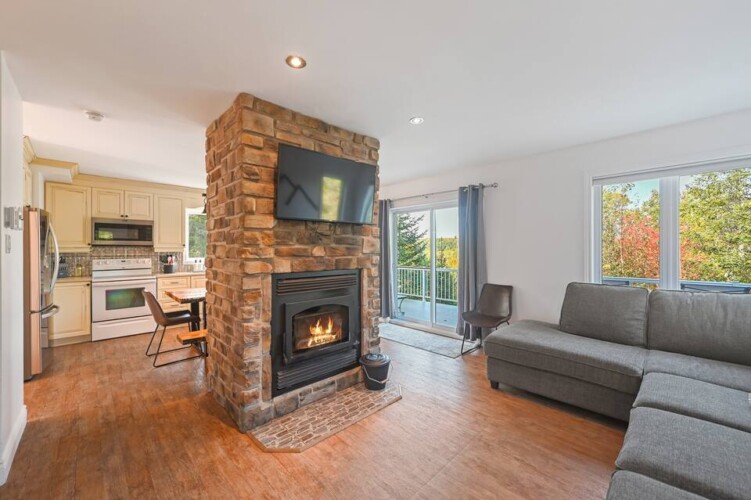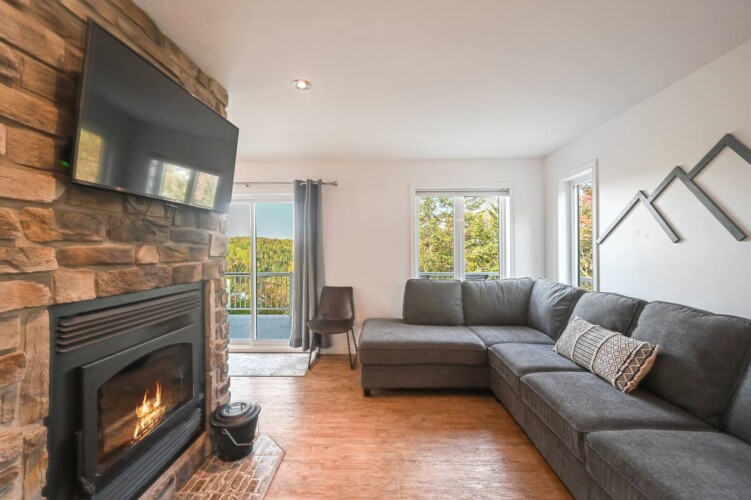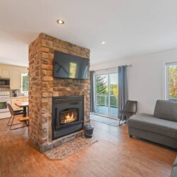 Dès votre arrivée au chalet, vous serez accueillis par une aire ouverte au rez-de-chaussée, délimitée par un foyer chaleureux.