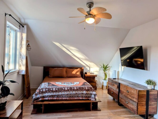 • 1 lit Queen (pour 2 personnes) et meuble de rangement.