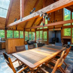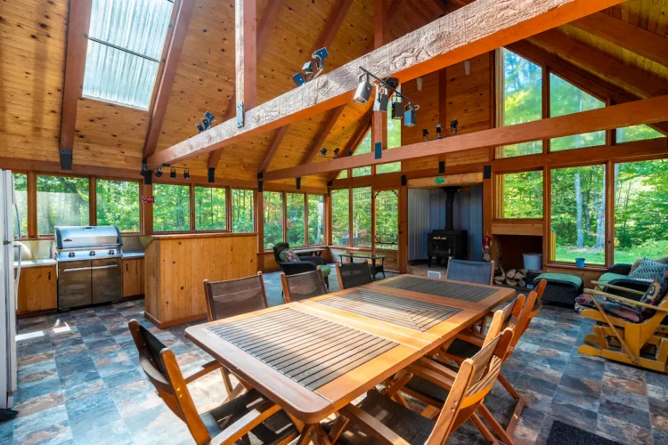 Le rez-de-chaussée donne accès à un très grand patio couvert avec abris moustiquaire nous permet de pleinement profiter des journées à l’extérieur. Nous y trouvons un espace pour cuisiner avec BBQ, une table à manger ainsi qu’un espace relaxant avec foyer au bois pour les soirées plus fraîches. Un espace pour les feux de camp est aménagé à l’extérieur en plus d’un terrain de pétanque. Vous avez aussi accès à un spa privé pour vous prélassez après une journée bien chargée. De bons moments en famille sont garantis à ce chalet.
