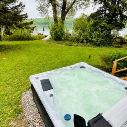 – Vous bénéficiez d’un accès exclusif au grand chalet ainsi qu’à toute la zone située en bord de lac (voir la photo du plan – zone bleu). Les garages et le petit chalet situés à l’arrière du terrain ne font pas partie de la location et sont séparés de votre espace.