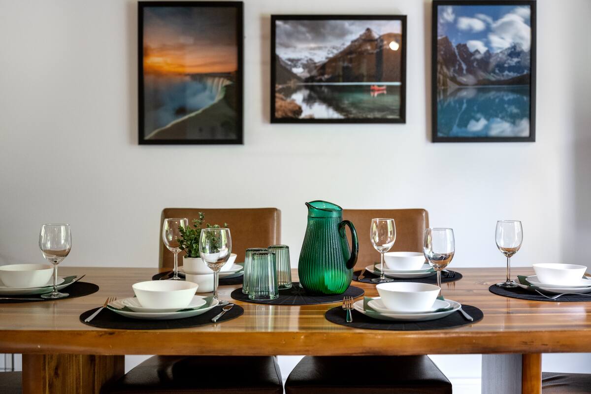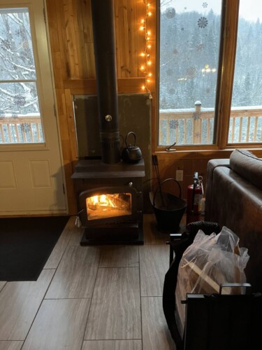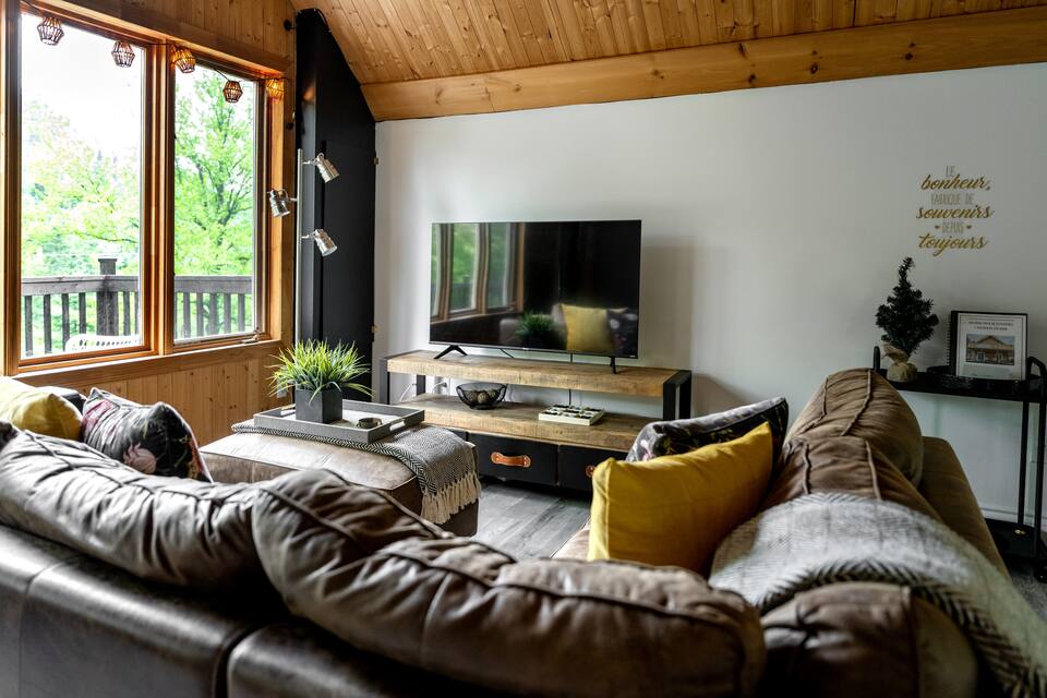 Un salon chaleureux avec poêle à bois, divan sectionnel confortable et téléviseur HD (Netflix inclus). Admirez la vue panoramique sur les montagnes, quelle que soit la saison.