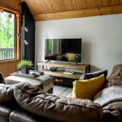 Ce chalet à toit cathédrale s’étend sur deux étages et se trouve sur un grand terrain privé. Profitez de son chemin d’accès, de ses terrasses entourées de forêt, et écoutez le doux murmure du ruisseau tout en vous relaxant dans le SPA, disponible toute l’année. Le wifi performant et le coin bureau en font aussi une option idéale pour le télétravail en pleine quiétude.
